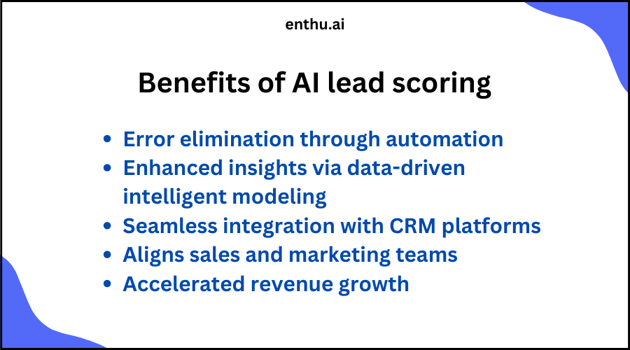 By giving scores to these leads based on all that info, AI guides sales folks towards the ones most ready to buy. This smart way of picking leads gets rid of random guessing and makes sure the team is aiming at those with the best shot at becoming real customers. Thanks to this approach powered by AI technology, companies can make their process for finding new business smoother than ever before, leading them to not just chase after every lead but focus on converting those into actual revenue growth. AI-driven lead scoring can improve conversion rates by up to 25%. Moreover, companies using AI for lead enrichment have reported a 40% increase in qualified leads. These statistics provide additional context and support to your paragraph, highlighting the effectiveness and impact of AI on driving sales efficiency.