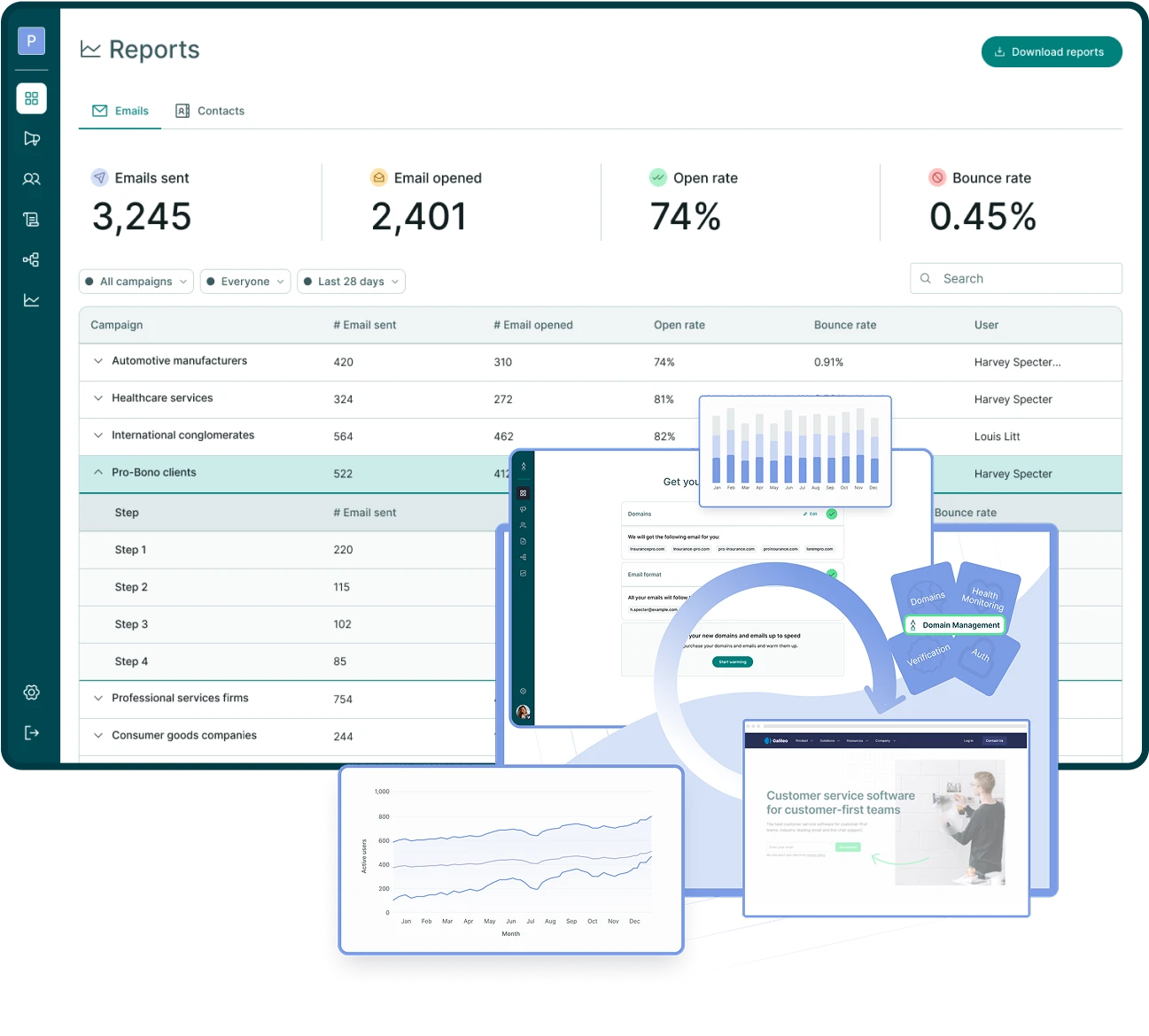 Our intelligent warm-up system gradually builds domain reputation while monitoring key deliverability metrics. Reach 3000+ daily emails per domain while maintaining peak inbox placement.